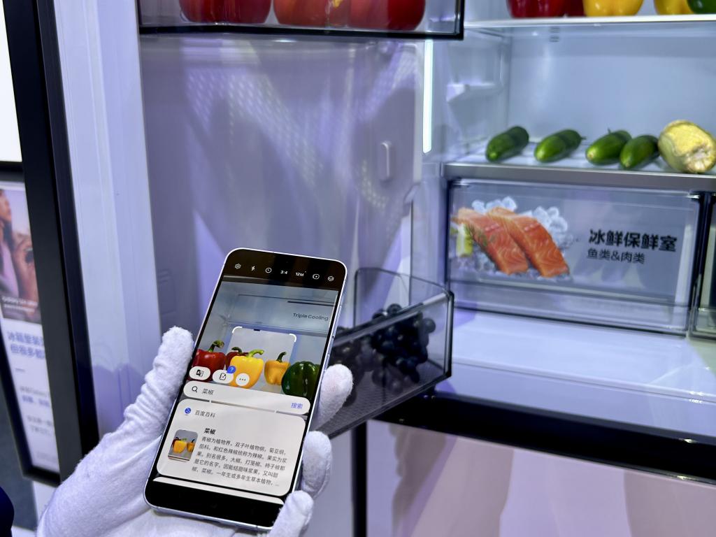 比如,三星展台上展示有 AI 冰箱。36 氪询问冰箱有哪些 AI 功能,工作人员拿出手机 Galaxy S24,打开摄像头,使用识别功能,调出了冰箱里甜椒的百度百科。