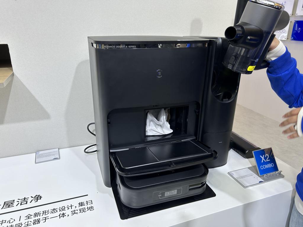 科沃斯展示了高端产品地宝 X2 COMBO,主要卖点是扫地机吸尘器二合一,不仅集成了扫地机,吸尘器也集成到了同一个尘袋,实现少倒一次灰。科沃斯工作人员表示,这是全球第一台集成了吸尘器的扫地机。