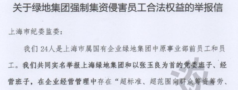 1 月 25 日下午,一份《关于绿地集团强制集资侵害员工合法权益的举报信》(以下简称举报信)在网络平台传播,举报人自称是 24 名绿地集团中原事业部的前员工,举报信的末尾留有个人签名、身份证和手机号码。