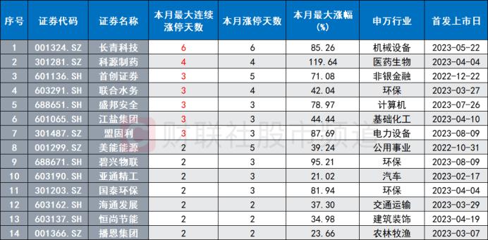 本月以来,次新人气牛股频出,以月内录得的最高连板数统计,今年 5 月上市的长青科技以 6 连板的高度成为 " 最强次新 ",且月内累计最大涨幅达 85.2%。若考虑创业板及科创板的 20cm 长度因素,创业板次新股科源制药以 4 连板的高度成为 "20cm 最强次新 ",且月内累计最大涨幅达 119.6%。此外,盛邦安全、联合水务、首创证券、江盐集团、盟固利 5 股也一度迎来大涨行情,其最高连板均为 3 板。
