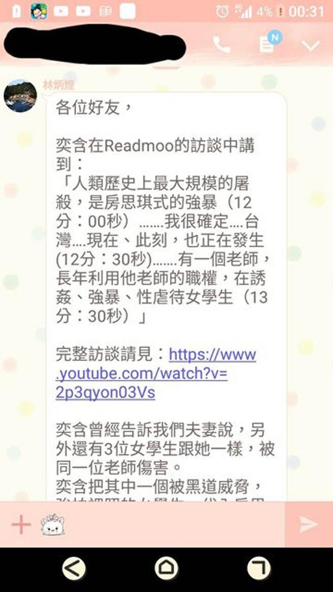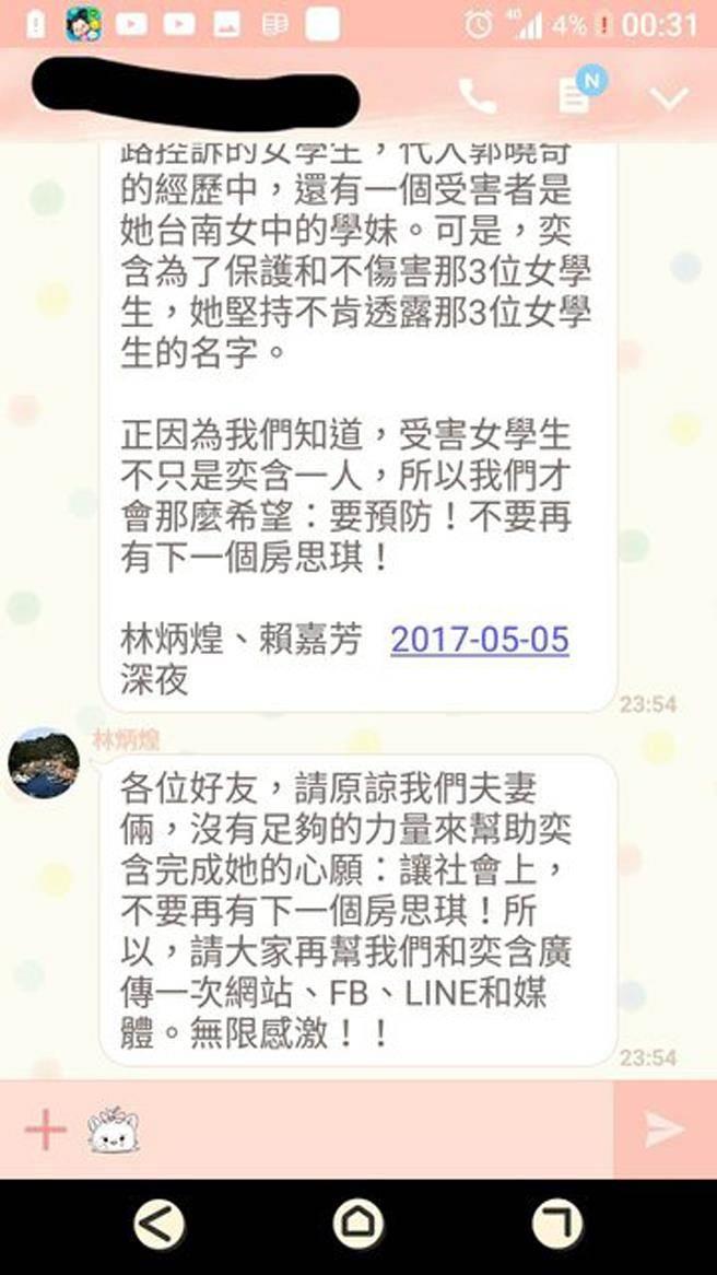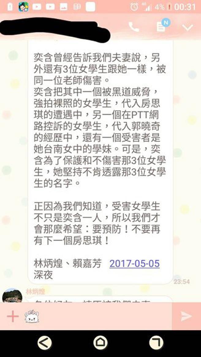 在她自杀后,出版社公开了林奕含父母的声明,林奕含的父母在声明中指出:“奕含这些日子以来的痛苦,纠缠着她的梦魇,也让她不能治愈的主因,不是忧郁症,而是发生在8-9年前的诱奸。”林奕含多年前曾遭补习班老师诱奸造成身心创伤,除了林奕含之外,还有三名受害人遭同一位老师性侵。