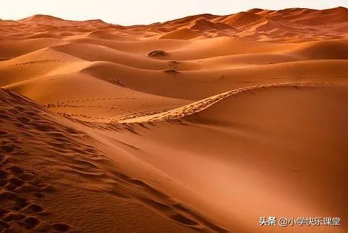 14、黄昏了,太阳正落下地平线,辽阔的沙漠被染成一片血色的红。