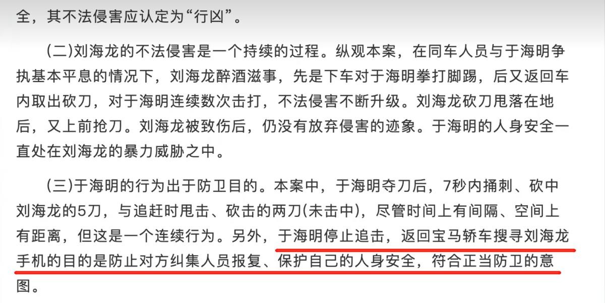 持正当防卫一方的观点是:于海明怎么知道对方犯罪中止没有,万一龙哥回头呢。且这一过程应该算连续性,不能上一秒你在砍我,下一秒被我夺刀,你就不具有侵害能力,我还不能追击,只能眼看你再拿装备或者叫人。所以应该算正当防卫。