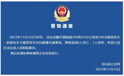 - 广西灵山警方:一面包车与重型货车对向碰撞,致6死1伤 2023年11月12日,广西钦州灵山县公安局发布《警情通报》,内容如下: 2023年11月12日5时许,灵山县檀圩镇国道209线3592公里加30...