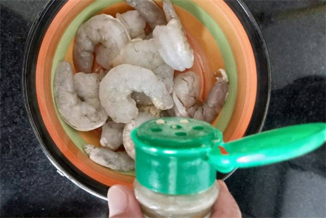我们先把买回来的虾去头,然后把虾壳去掉,在虾背,还有虾肚上的虾线剃掉,清洗干净放入适量的胡椒粉再加上一点点的料酒,充分的抓匀,腌制10~15分钟可以让虾更加的入味。