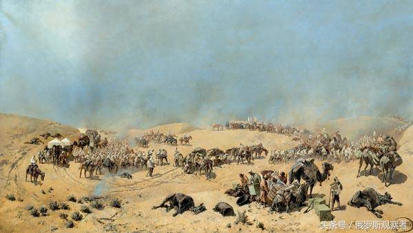 俄国征服中亚的参与者尼古拉·卡拉津的油画《1873年希瓦汗国之远征》,这幅作品于1888年完成