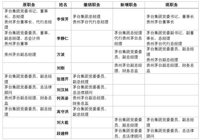 原茅台集团副总经理李静仁,升任茅台集团总经理;原贵州茅台副总经理万波,兼任茅台集团副总经理;另外,原茅台集团副总经理张德芹、高守洪卸任;刘大能新任茅台集团党委委员、副总经理。