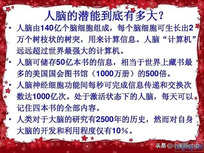人类本身具有却没有被开发出来的能力叫做潜能。潜能,是一种对外界刺激感应很敏锐的东西;而且它一旦被唤醒之后,仍需不断地教育和鼓励,诚如有音乐、艺术天赋的人必须注意培养和坚持一样。否则,潜能和才能,会像鲜花一样,容易枯萎或凋零。