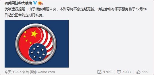 美国驻华大使馆12月23日通过官方微信公众号“美国驻华大使馆”和官方微博@美国驻华大使馆 发布运行提醒,称由于拨款问题未决,本账号将不会定期更新。请注意所有领事服务将于12月26日起按正常约定时间恢复。