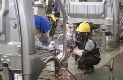 5月23日,在日照市五莲县五征集团焊装车间,工人为汽车车身上机器人焊接不到的位置进行人工加焊。 新华社记者 李紫恒 摄