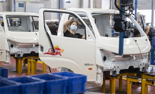 5月23日,工人在日照市五莲县五征集团总装车间进行汽车内饰安装。 新华社记者 才扬 摄