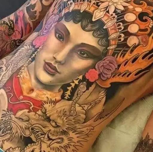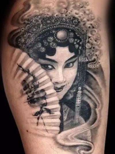 近几年艺伎纹身很火,很多人认为那也是传统纹身,其实相对于我国传统文化而言,花旦比艺伎更富有我国特色。从形态和造型上来说也是更胜艺伎一筹。我们所了解的艺伎大多是配合般若形象出现,而花旦就是以自身优美的形象在皮肤上表现出来,这种传统的美是艺伎无法媲美的。