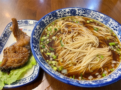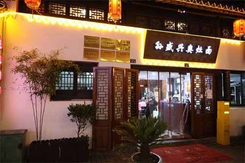 山塘街还有一家面馆,孙盛兴奥灶面馆,这是山塘街附近评价不错的。于是选择它家,点了奥灶面+爆鱼,先吃面,面汤味道很一般,没什么好吃可言,普普通通。之前在北京时吃过松鹤面馆的红汤面,汤很鲜,面很细。这家的奥灶面相比起北京那家还要差很多,虽然到北京估计口味已经不如苏州当地的了。爆鱼加进去后,对于汤的味道也没有什么大改变,相当于面里加了一道菜。爆鱼本身的味道还可以,外皮是酥的,有点像上海熏鱼的味道,属于甜口的。