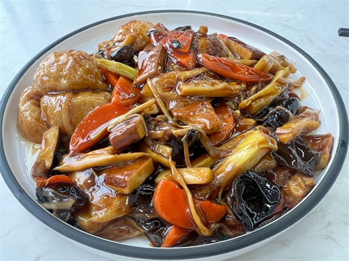 炒素,在它家的推荐菜里排名靠前,里面又笋片、胡罗卜、豆干、面筋、黑木耳,还有一种是莼菜还是黄花菜没偿出来,更显莼菜。汁是很甜的,但很好吃,每个食材都有单独的味道,但吃多了有些腻。价格20元,真实惠。
