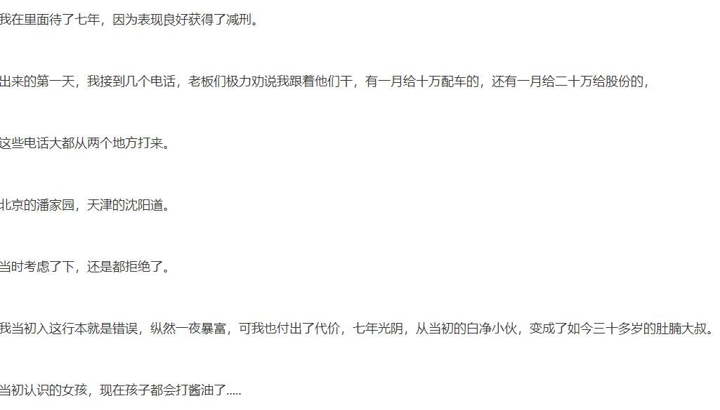 当时考虑了下,还是都拒绝了。我当初入这行本就是错误,纵然一夜暴富,可我也付出了代价,七年光阴,从当初的白净小伙,变成了如今三十多岁的肚腩大叔。当初认识的女孩,现在孩子都会打酱油了.....