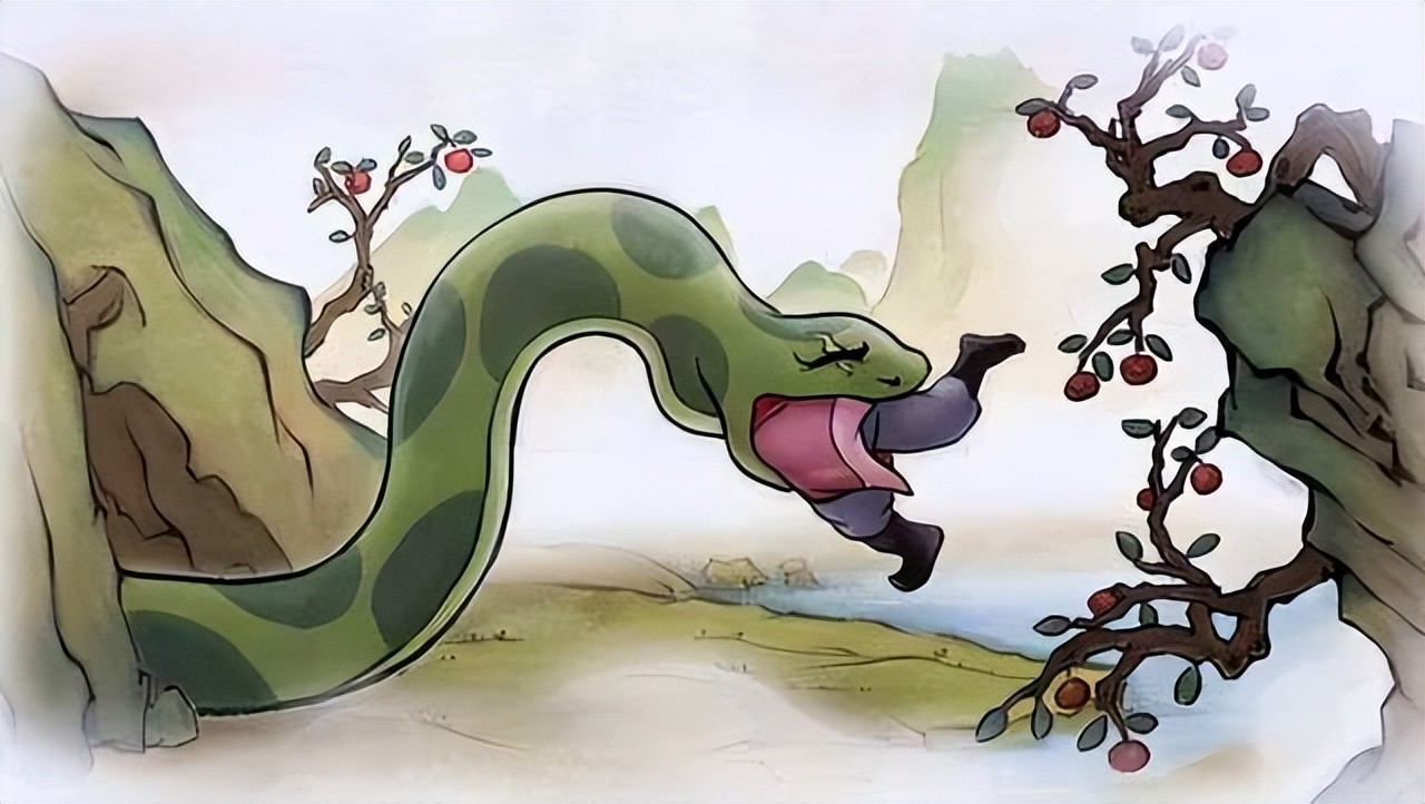 但很不幸,他们并没有找回自己的母亲,而是发现了一条巨大的蟒蛇正在消食。而蟒蛇附近掉落的鞋子,则证明了他们的母亲已经被蟒蛇吞进了肚子。