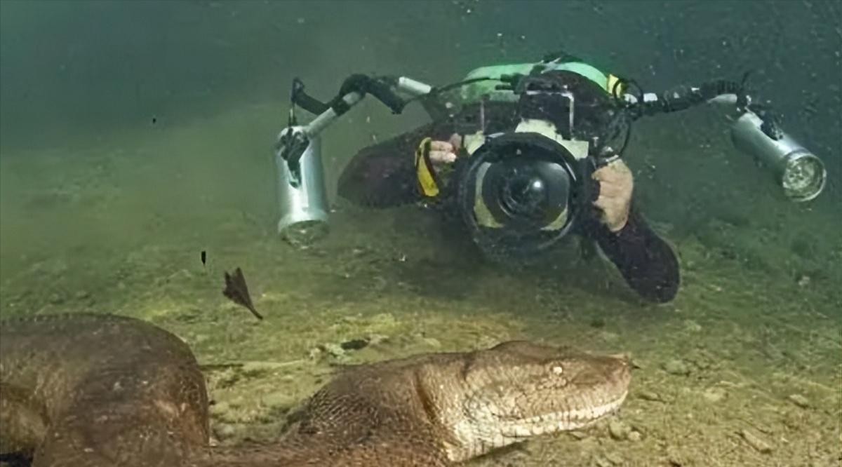 当时的水生物学家准备记录亚马逊河河底的一些水生生物,游着游着他发现了一条正在河底休息的森蚺,这条森蚺十分巨大,目测都有5.7米长。
