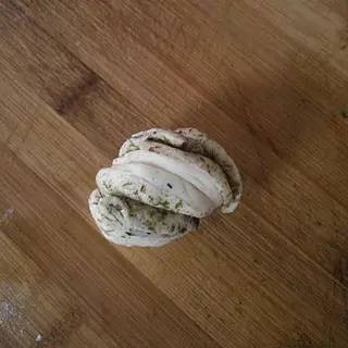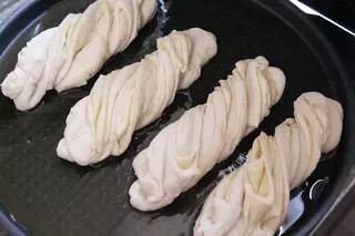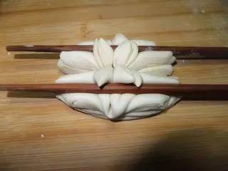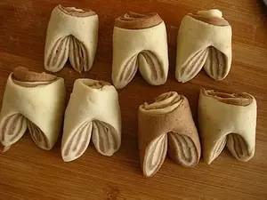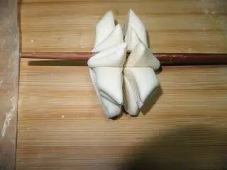 1、所有材料和在一起发酵至2倍大小,切成大小一样的剂子,每两个一组,做这个莲花卷面团要硬一点比较好。