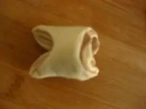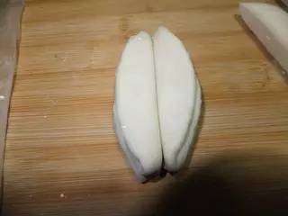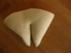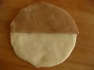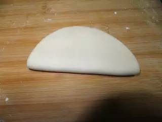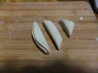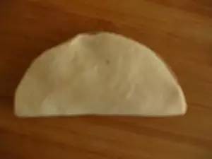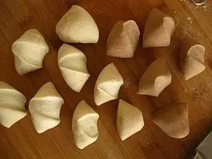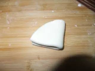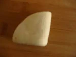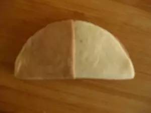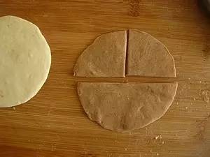 10、扇形的中心沿半径切开,这个长度决定猪蹄的长短,我基本至一半,所以猪蹄显得比较短,若想做个长猪蹄,需面皮擀大,三分之一处切开,不过要擀薄,不然猪蹄就太胖了。