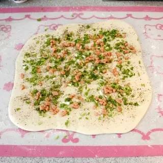 7、发酵好的面团反复揉均,擀开成面片,将面片上刷一层油,撒上盐和花椒粉,再撒上葱花和火腿肠末。