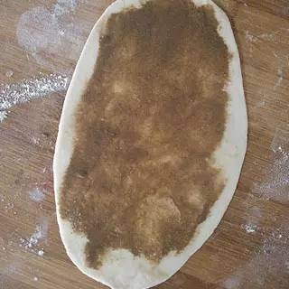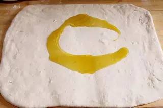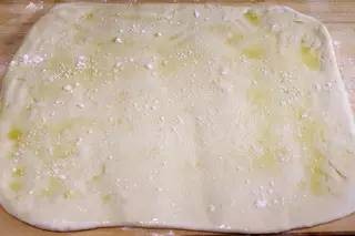 3、将面团擀开,然后倒入适量胡麻油,如图所示。