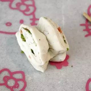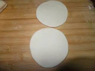 6、取一白面皮,放一可可半圆面皮,对齐。