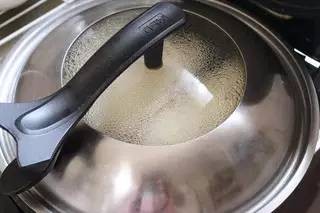 8、盖上锅盖,加热十分钟左右,煎制花卷底部金黄即可。