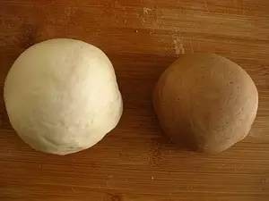 2、发好的面排气,分成两个面团,小的一份加可可粉揉成可可面团(也可做成其他颜色其他口味比如说紫薯之类,做法基本相同)。