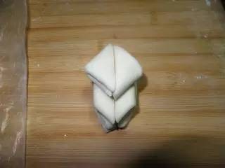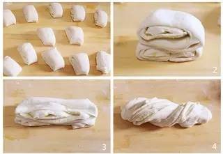 6、将大卷切成大小相同的小剂子,然后两个小剂子叠在一起、轻轻拉伸、稍稍卷一下就可以做成一个花卷了。