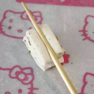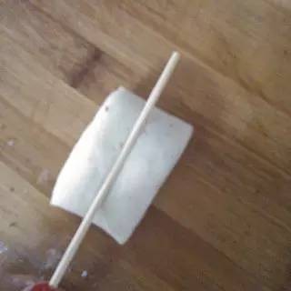 8、卷起来,切成均匀的小剂子,将两个小剂子重叠起来,用筷子在中间压一下。
