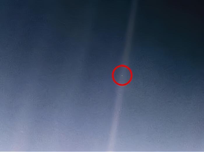 上图为旅行者1号探测器于1990年2月14日给地球拍摄的一张照片,当时它与地球的距离大约为64亿公里,从中我们可以看到,在这个位置上,地球已经变成了一个暗淡的光点,看上去就像一粒飘浮在阳光中的微尘,而就是这粒“微尘”,却承载了古往今来所有人类的全部。