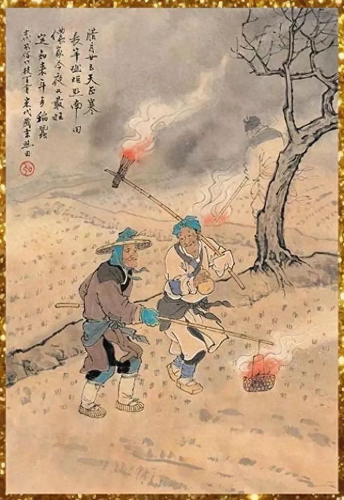 照田蚕也叫"烧田蚕"、"烧田财",是流行于江南一带的民间祈年习俗。腊月二十五这一天将绑缚火炬的长竿立在田野中,用火焰来占卜新年,火焰旺则预兆来年丰收。有些地方在年三十举行这一活动。