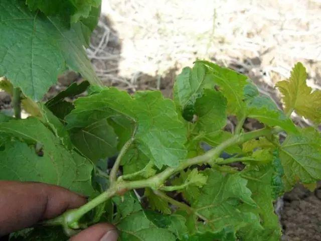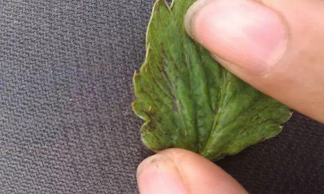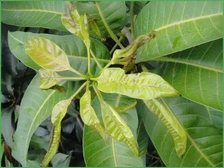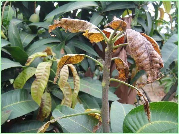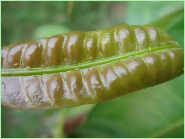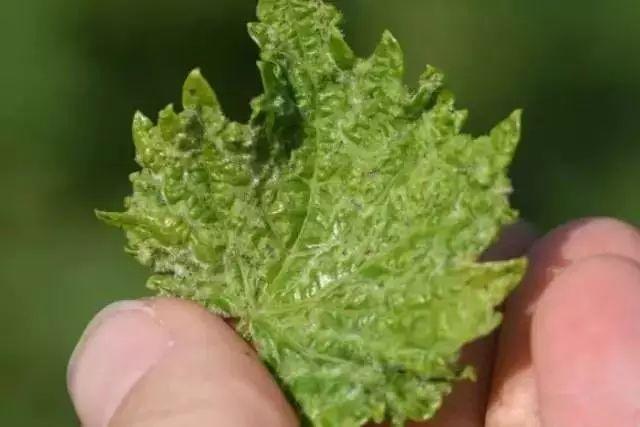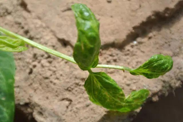 嫩叶嫩梢变硬卷曲枯萎,叶面上有密集的小白点或长条状斑块,后期叶脉变黑褐色,受害嫩梢节间变短,生长缓慢。
