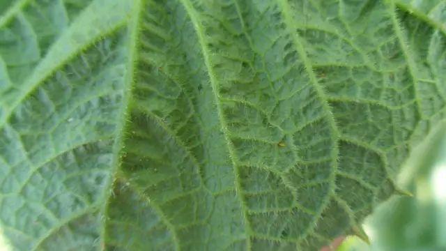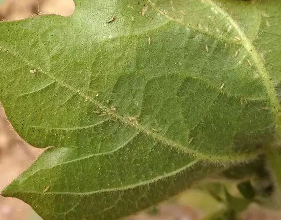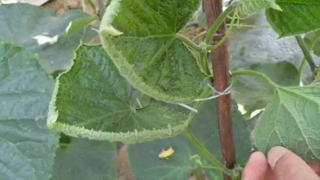 叶背面出现长条状或斑点状黄白、银灰色斑块,后期斑块失绿、黄枯、叶脉变黑褐色,叶片逐渐皱缩、干枯。