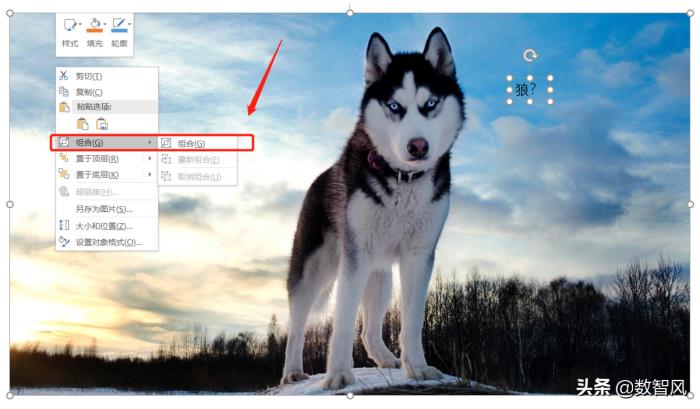 ③、框选整个图片,务必将文字也选择上。然后点击右键,选择“组合”菜单将文字和图片组合成一个整体形状。