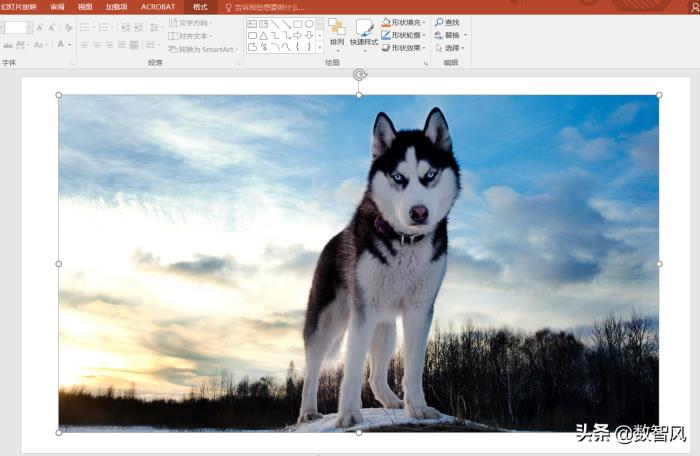 ①、打开PPT程序,然后将照片拖拽到PPT的空白页面中。如果照片过大,可以通过照片上有八个把手来调整到合适的大小。