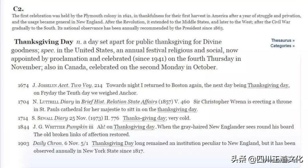 在给感恩节下定义之前,OED精简扼要地记述了这个节日的来龙去脉: