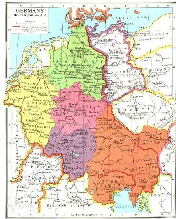 神圣罗马帝国的皇帝一心想把意大利纳入帝国版图,数次进攻意大利,为了获取邦国的财力物力支持给予了邦国一些权力,由此也导致了邦国的分裂,德国的绝嗣导致了大空位时代,哈布斯堡家族继承了帝位,德意志再次名义上的统一。