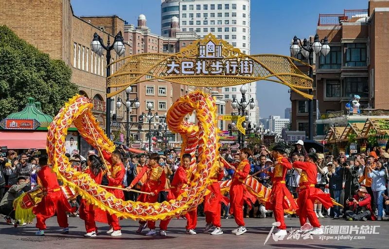 2024年9月13日,演员在乌鲁木齐大巴扎步行街开街仪式上为游客表演舞龙 。石榴云/新疆日报记者 约提克尔·尼加提摄