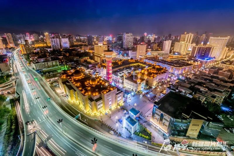 2018年10月4日,新疆国际大巴扎夜色(无人机摄)。石榴云/新疆日报记者 周鹏摄