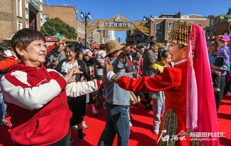 2024年10月1日,游客和演员在乌鲁木齐大巴扎步行街一同跳起欢快的舞蹈。石榴云/新疆日报记者 约提克尔·尼加提摄