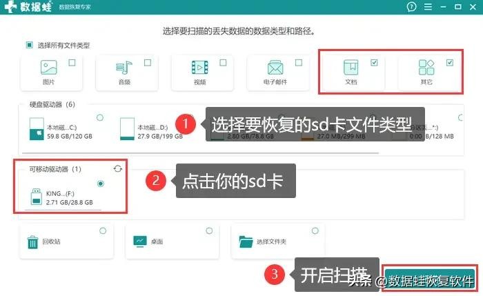 冷静下来之后,你可以寻找一款合适的软件,尝试恢复丢失的数据。例如数据蛙恢复专家,当格式化sd卡后,它可以帮你深度搜索丢失的文件、照片、文档、音视频等数据,而且有可能就此恢复,解决数据丢失的困扰。下面为你分享它的使用教程: