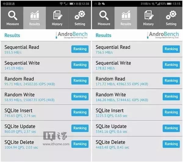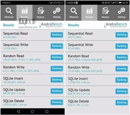 根据网友们晒出的自己华为P10手机AndroBench内存读写速度测试结果,不同用户之间的测试成绩差异明显,例如有的用户测出的顺序读取速度为700-800MB/s,这应该是UFS 2.1的水平,而也有不少用户测出的顺序读取速度为500-600MB/s左右,应该是UFS 2.0的水平,同时,还有相当一批用户测试的结果仅为200-300MB/s的水平,这差不多就是eMMC 5.1的性能水准。当然,也有网友表示这可能有不同用户使用的AndroBench测试软件版本影响的关系,但测试成绩差异如此悬殊,难免让很多网友不淡定。