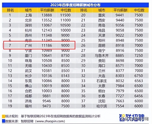 根据近日智联招聘网发布的《中国企业招聘薪酬报告》,广州市2023年第四季度求职期的平均薪酬为11186元/月,在全国38个主要城市的薪酬水平中排在第7位,中位数为9000元/月。