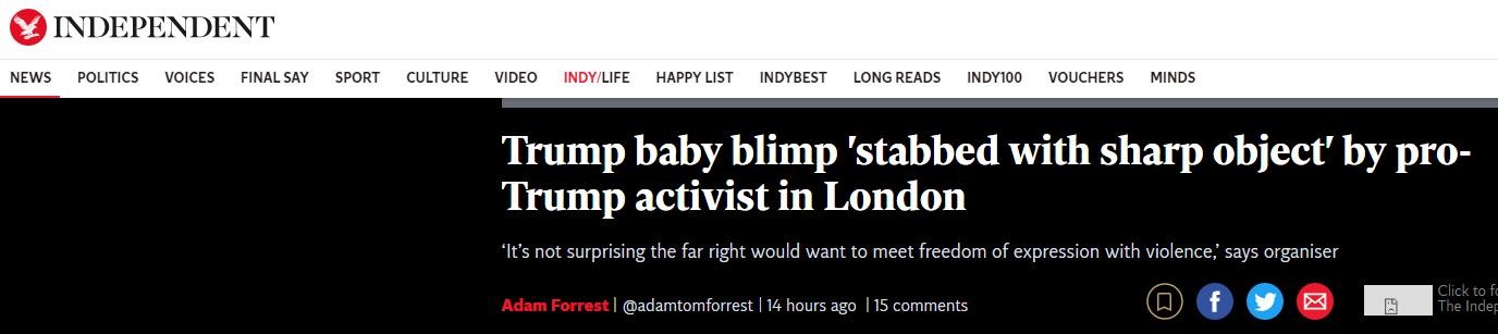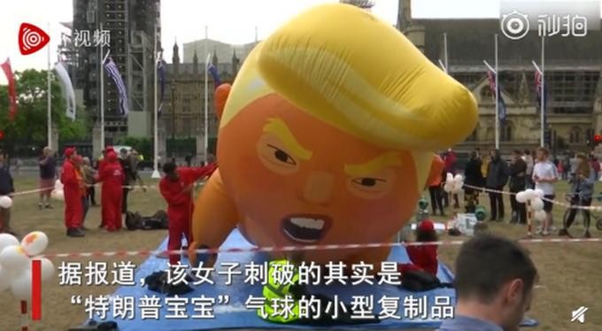 然而,根据看管“特朗普宝宝”的“保姆”团队说法,当天晚时,一名特朗普女支持者靠近英国下议院外的活动人群,并用尖锐物从背部刺破了“特朗普宝宝”的复制品。“一名女性...用尖锐物戳破了‘特朗普宝宝’的小型复制品”,该团队发言人说。