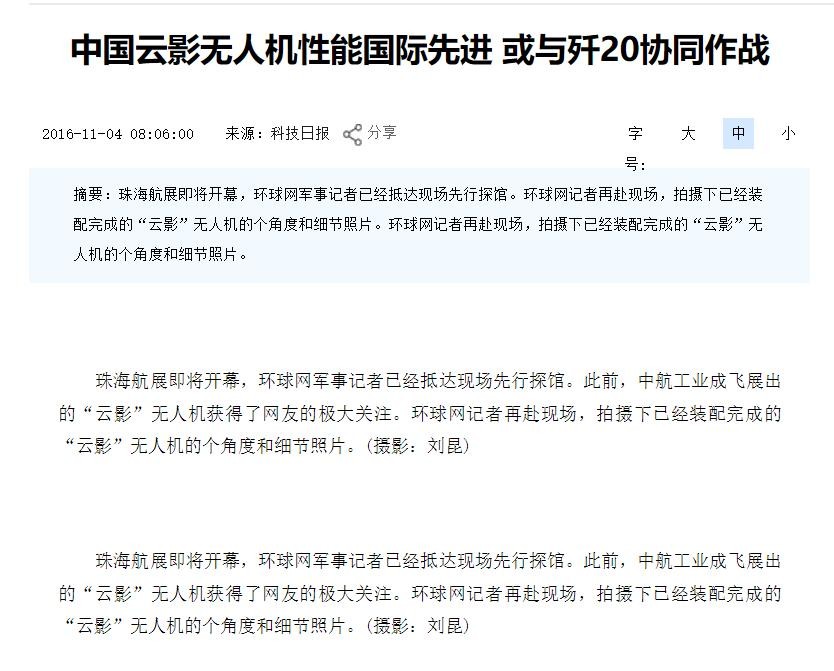 海外网:中国云影无人机性能国际先进 或与歼20协同作战