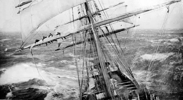 1920年代,一张帆船航行的照片,当时的西洋帆船收放帆全靠人肉在桅杆上操作,无论怎样的天气,在起伏摇摆的大海上