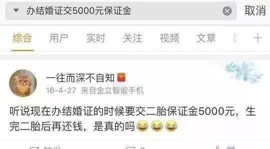 近日,网上流传婚姻登记时需收取5000元“二胎押金”,若不生二胎,此“二胎保证金”则无法退还。