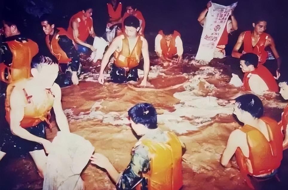 当时哪里已经是一片泽国,日夜不停的雨水加上磅礴的长江水流,让整个抗洪工作变得无比艰难,战士们扛着沙包一遍一遍地封堵着堤坝上的缺口。