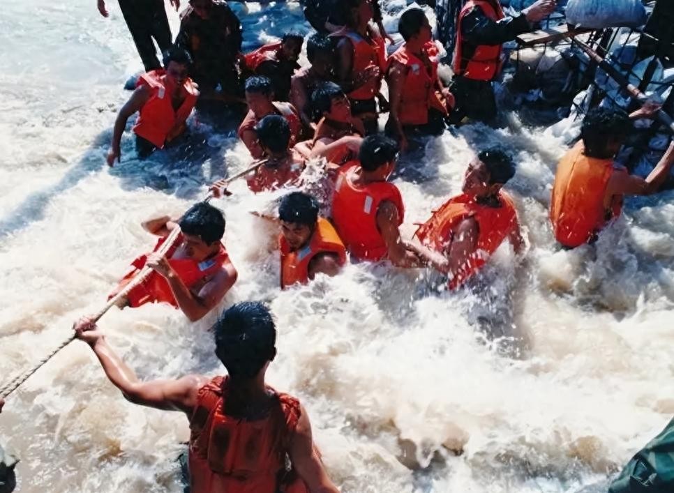 下水就会有被冲走的危险,即使战士们手拉着手、腰间绑着绳子,可强大的水流也会扯断绳子。